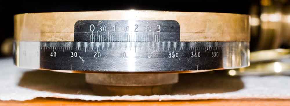 Same RA Setting Circle but reverse side with the Eyepiece reading the Vernier scale. One can make out literally tenths of millimeters...